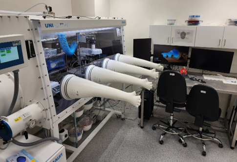 Full motorized system system is placed inside a N2 filled glovebox for O2/moisture sensitive materials transfer.